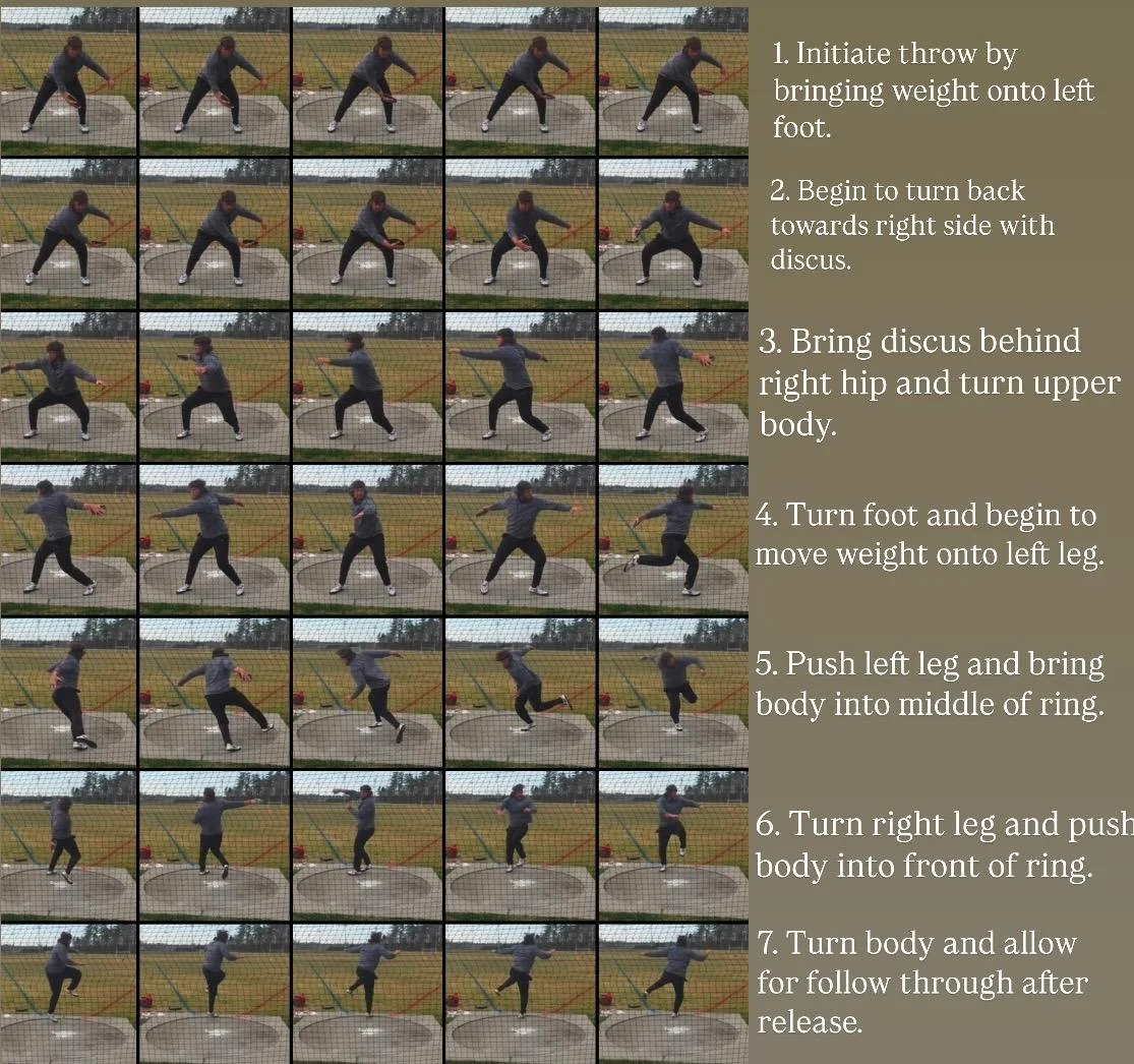 This instructional approach leverages the visual learning modality, potentially enhancing comprehension and retention of the technique for learners. The sequential nature of the images, coupled with the precise timing of the captures, allows for a nuanced understanding of the discus throw's biomechanics and the interconnectedness of the various body movements involved. The supplementary textual descriptions likely serve to reinforce the visual cues and provide additional clarity on the subtle nuances of the technique that may not be readily apparent from the images alone.